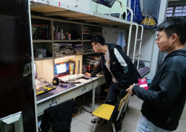 任恒与郑征在菊园8号男生公寓看望走访学生,在走访中两位老师针对同学们反映的宿舍维修,近期教学安排等问题进行了现场处理与解答。