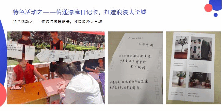 以心理健康月、心理活动周等为契机,广泛开展“书写心雨心愿,展望美好未来”、“传递漂流日记卡,打造浪漫大学城”、“体验趣味游戏·享受快意人生”、“心灵画卷,描绘出自己的色彩”、最美校园摄影短视频大赛等特色活动,定期举办心理沙龙、心理健康讲座、心理健康知识竞赛、心理趣味运动会、心理朋辈帮扶等主题活动,在实践活动中浸润学生的心灵、培育优良品质、坚守道德底线。