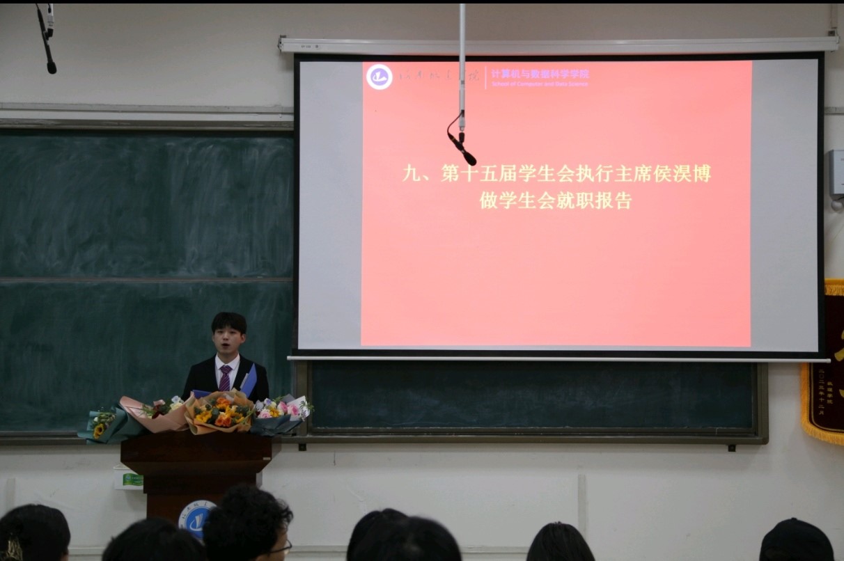 随后,张星和王占洲为学生会主席团和部长团颁发聘书,新老届学生会进行会旗交接仪式,第十五届执行主席侯淏博做就职报告,深感肩负承上启下的责任,必将全力以赴,以饱满的热情与精力投入到为广大师生服务的工作中。最后,王占洲致闭幕词,肯定了上一届学生会的各项成绩,给予了高度赞扬,号召新一届学生会能够牢记“全心全意为同学服务”的宗旨,开创我院院风建设、学风建设、班风建设、校园文明建设的新局面。