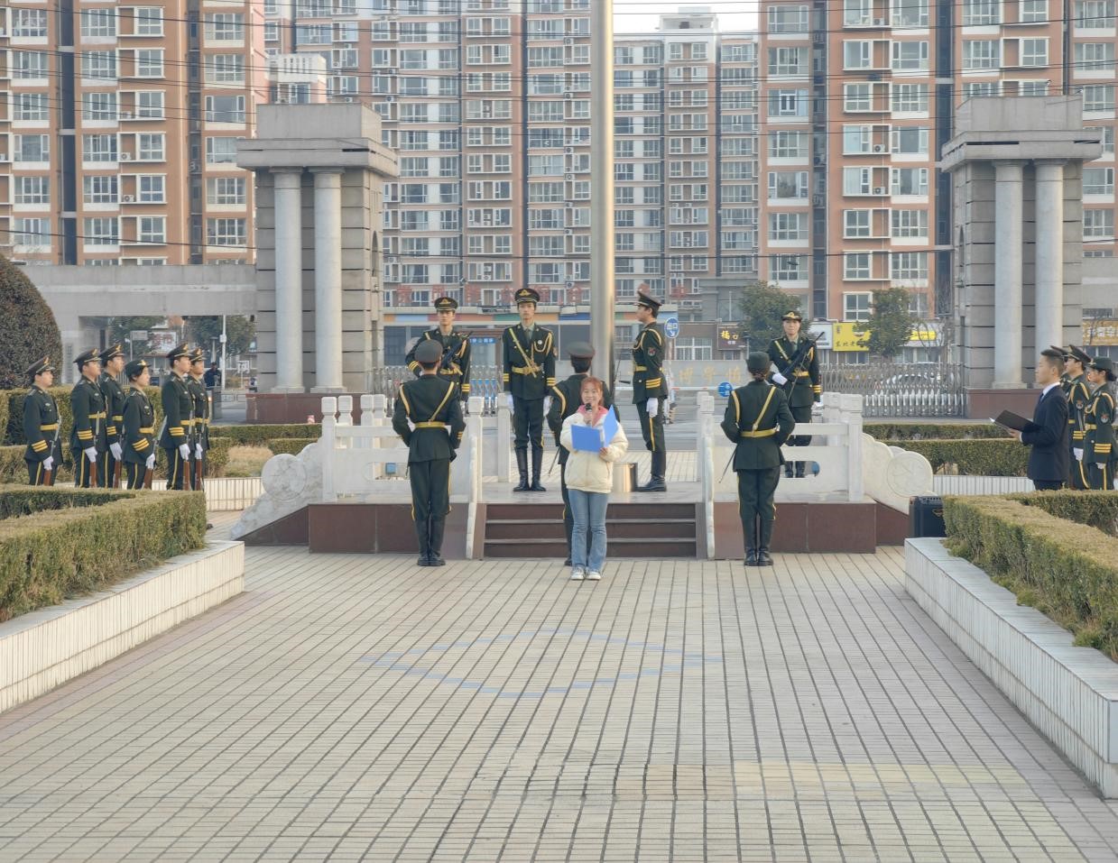 清晨六点半,参加升旗仪式的师生整齐列队,庄严肃穆迎接国旗。六点四十,随着国旗护卫队步伐坚定,脚步整齐划一的声音,升旗仪式开始。升国旗奏国歌,全体师生行注目礼,鲜艳的国旗在《义勇军进行曲》的歌声中缓缓升起,整个广场顿时洋溢着肃穆庄严的氛围。国旗迎风飘扬,国旗下我院学生代表韩雪冰讲到“青春须早为,岂能长少年”的名句,把青春的奋斗与拼搏融入国家发展中,为实现中华民族伟大复兴的中国梦贡献自己的力量。