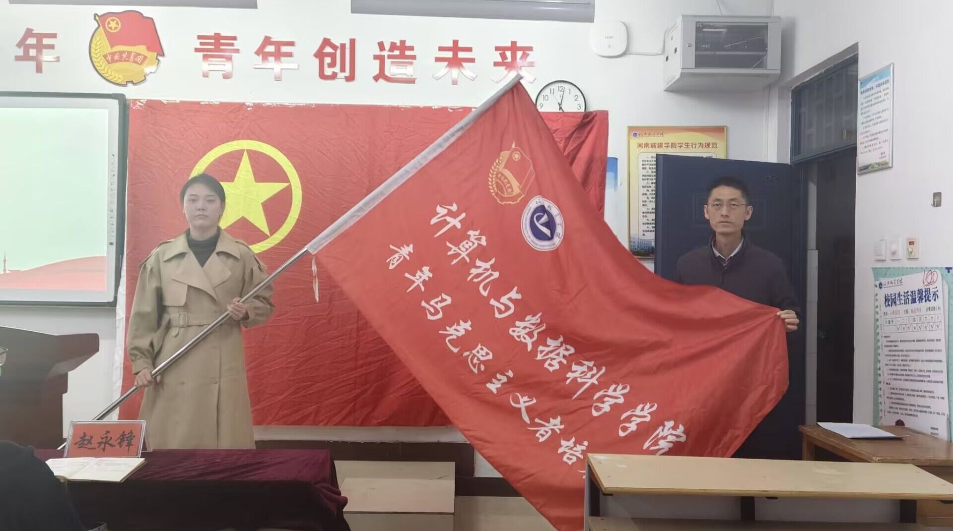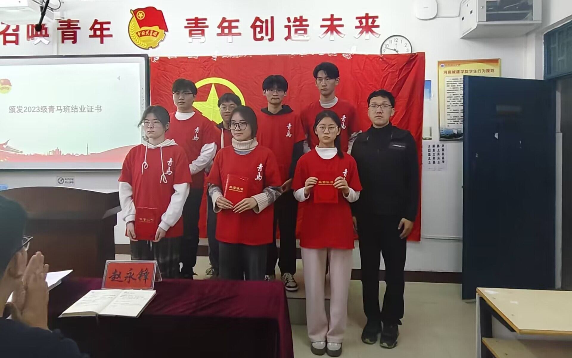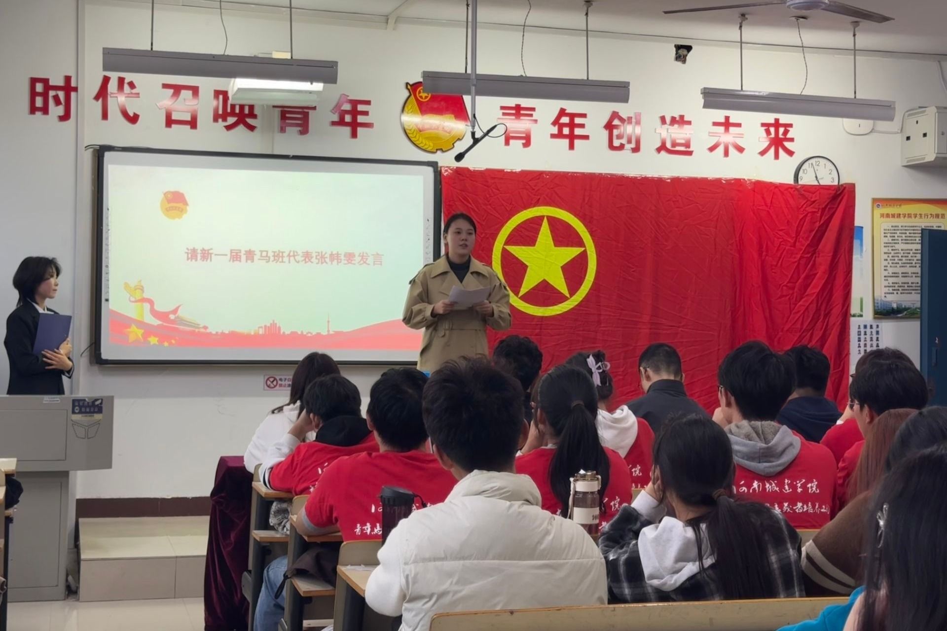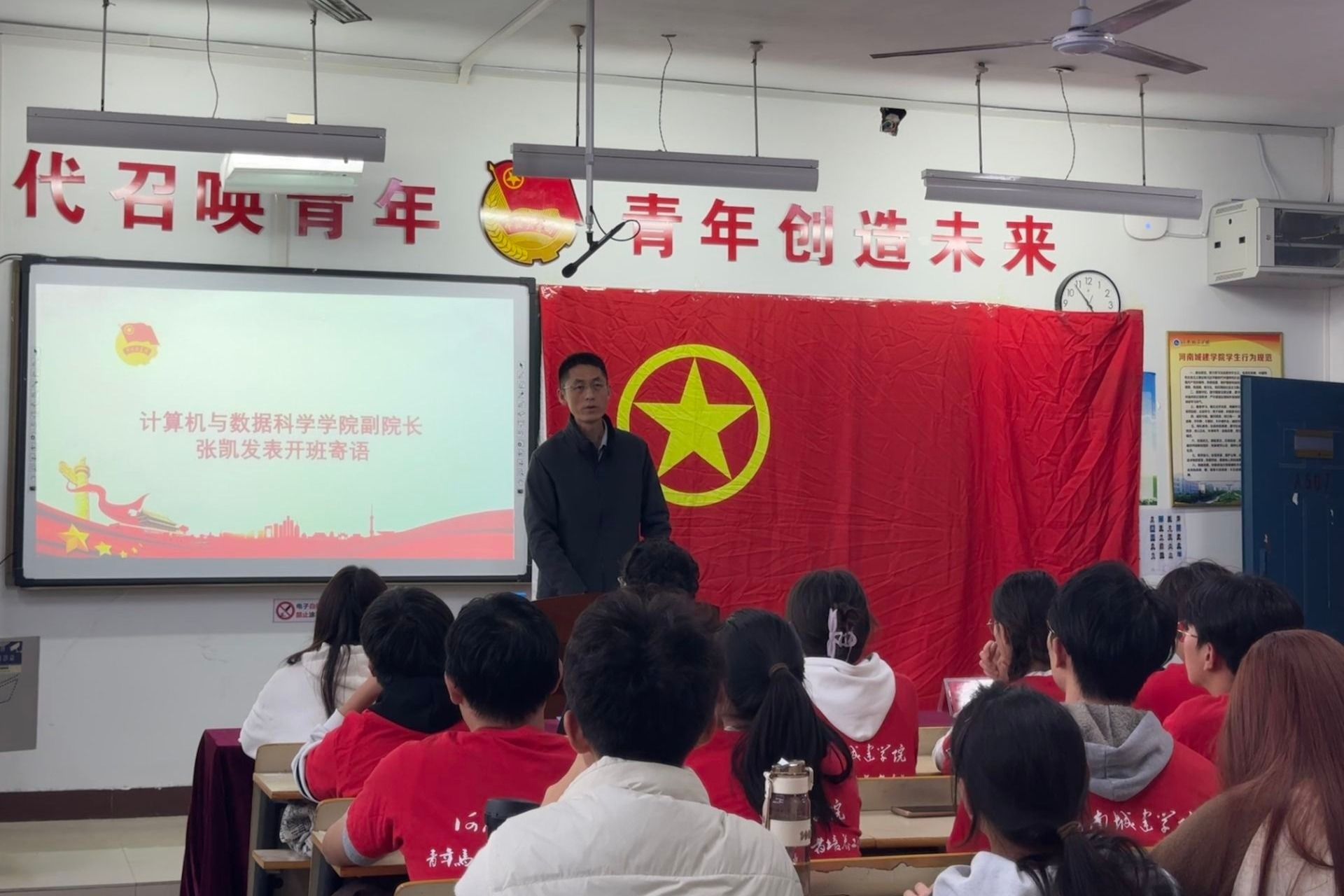 仪式在庄严的国歌声中开始。进行的是结业仪式。王占洲对2023级青马班学习情况进行结业总结,肯定了学员们的努力和进步,并为其颁发了结业证书。赵永峰为2023级青马班优秀学员颁发荣誉证书,对他们的刻苦学习给予了高度评价。张凯给2024级青马班全体成员作寄语,希望他们铭记初心使命,致力于成为新时代有理想抱负、勇于担当、勤勉不懈、持续进取的青年才俊。张凯向青马班代表授予了团旗,引领全体师生及青马班成员共同宣读入团誓词齐唱团歌,并以“青春心向党,建功新时代”为题,为2024级学员讲授了开班第一课。