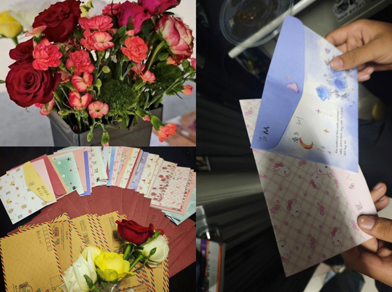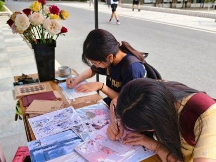 活动前期通过班级群广泛宣传,吸引师生踊跃参与。现场设置木质信箱与粉色主题展台,参与者可在定制日记卡上匿名书写校园生活感悟、未来期许或情感寄语,装填信封后投递至信箱。每名参与者均获赠一朵象征温暖的小红花,现场氛围温馨热烈。