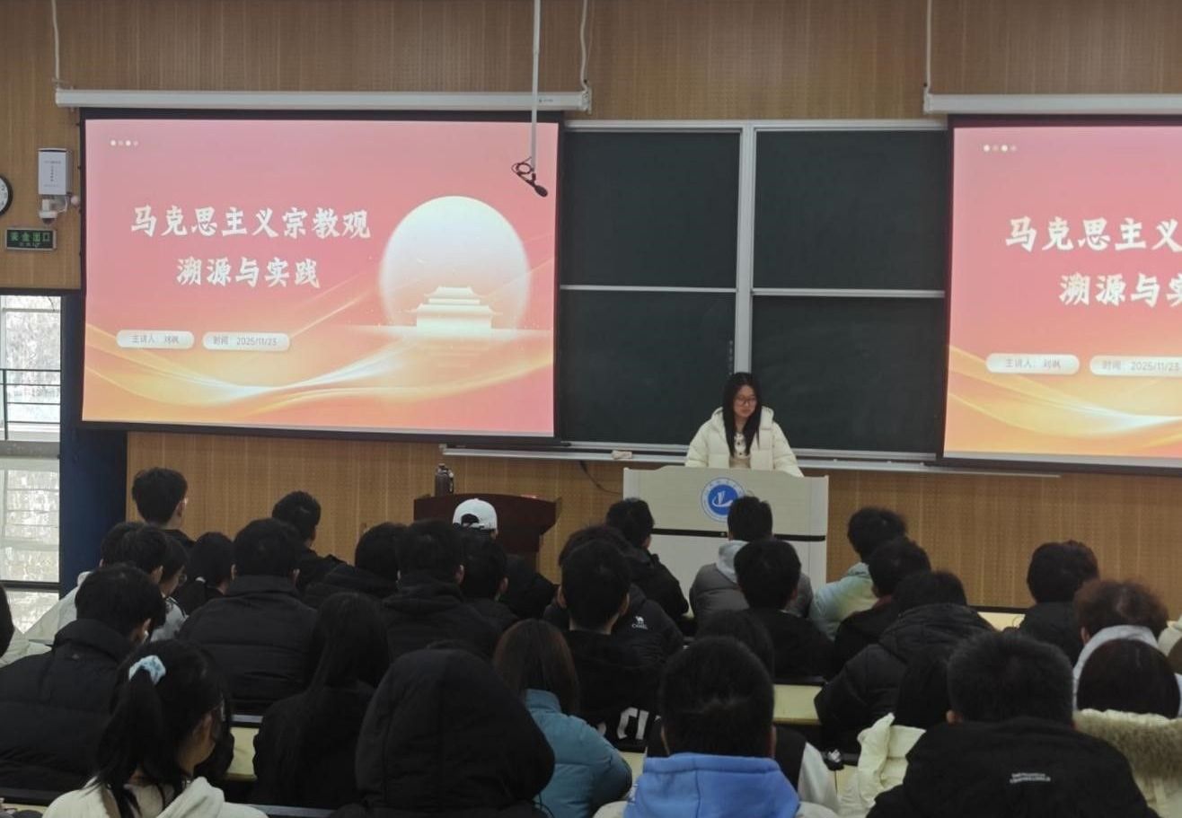 主讲人刘飒通过理论溯源、经典文献片段解析,梳理了马克思主义宗教观的形成脉络,重点阐释“宗教是社会存在的反映”“宗教的历史性与阶段性”等核心观点,结合当代社会现实,辨析宗教与科学、宗教与社会主义社会相适应的基本原则,引导同学理性看待宗教现象,强化了对马克思主义宗教观的理解与运用。